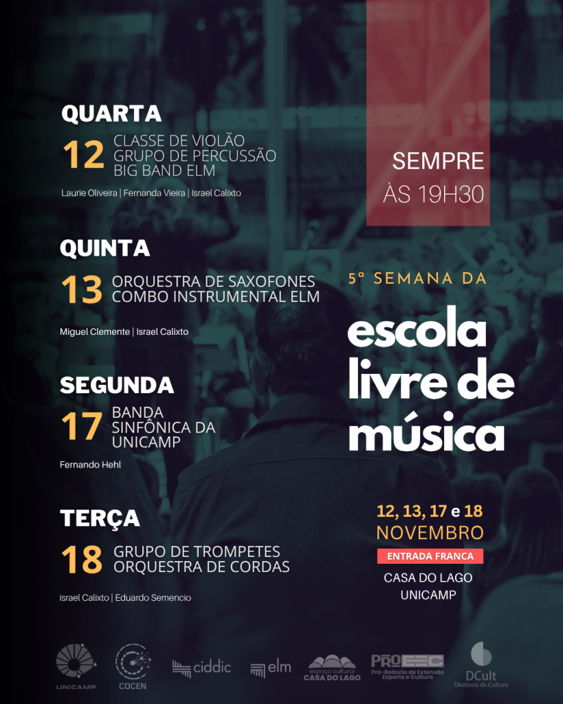 A Escola Livre de Música da Unicamp (ELM) convida toda a comunidade acadêmica e público em geral da Grande Campinas para prestigiar a 5ª Semana da Escola Livre de Música, que acontecerá nos dias 12, 13, 17 e 18 de novembro, sempre às 19h30, na Casa do Lago da Unicamp.