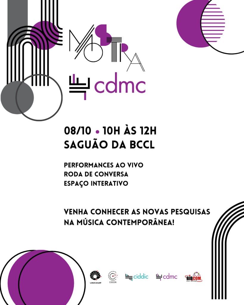 A Mostra CDMC, festival promovido pelo Centro de Documentação de Música Contemporânea da UNICAMP, realiza sua primeira edição no dia 08 de outubro das 10h às 12h, no saguão da BCCL. O evento tem como objetivo difundir a música de concerto contemporânea e divulgar as pesquisas realizadas a partir do acervo do centro.