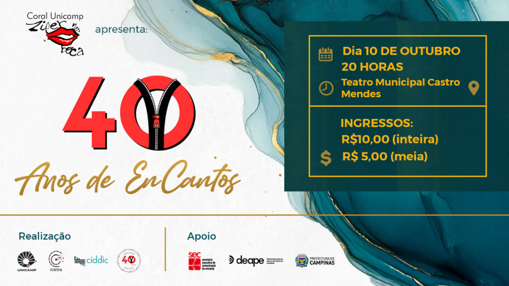 O Coral Unicamp Zíper na Boca celebra seus 40 anos de atuação ininterrupta com o espetáculo coral-cênico “Zíper na Boca: 40 anos de EnCantos”. Esta comemoração especial ocorrerá no dia 10 de outubro, sexta-feira, às 20h, no prestigioso Teatro Municipal José de Castro Mendes. Sob a regência e direção artística de Vívian Nogueira, o repertório reúne música popular brasileira e internacional, em arranjos especialmente dedicados ao grupo no decorrer de sua longa trajetória. Canções de Mílton Nascimento, Chico Buarque, Djavan, Tim Maia, Toquinho e Vinícius de Moraes, Elton John, Beatles, além de sambas de Ary Barroso, Adoniran Barbosa, Premê e um baião de Sivuca compõem esta diversificada coletânea artística, reunindo música e cena de forma vibrante e envolvente!